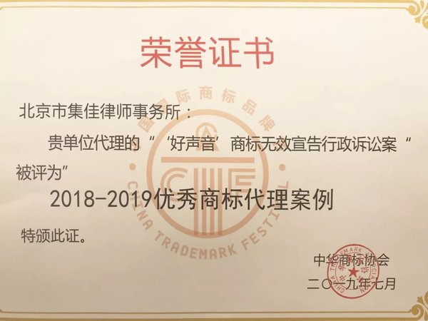 >新浪体育>关于我们>荣誉概览>2019>集佳代理“好声音”商标无效宣告行政案入选“优秀商标代理案例”